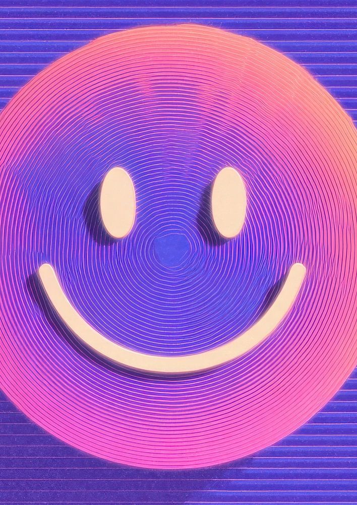 This artwork features a minimalist, abstract smiley face on a purple background. The retro-inspired colour mix, combined with neon lights and glitch effects, creates an eye-catching, digital aesthetic. The round shape, bold contrasts and subtle shadows add depth to the design, while the vibrant colours and textured surface add dynamism. Inspired by retro, cyber and digital art, this piece combines playful symbolism with futuristic expression, bringing the glamour of the neon era to a modern, digital form.