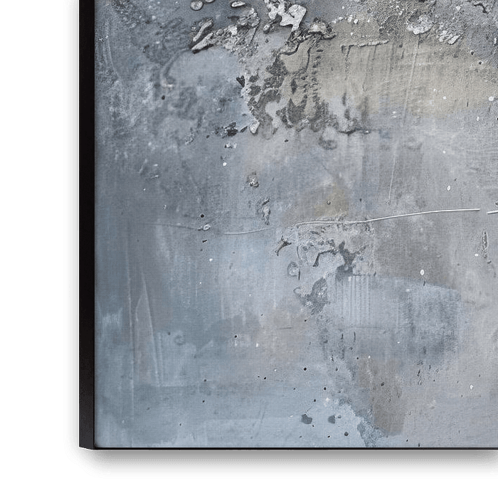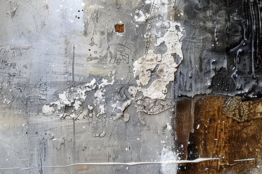 Abstract painting with mainly neutral tones such as grey, white and brown. The painting exudes a sense of rustic decay in industrial style. This painting can add depth and complexity to an interior through its rich textures and muted colours. It fits well in an industrial or modern minimalist living style due to its raw materials and textures.