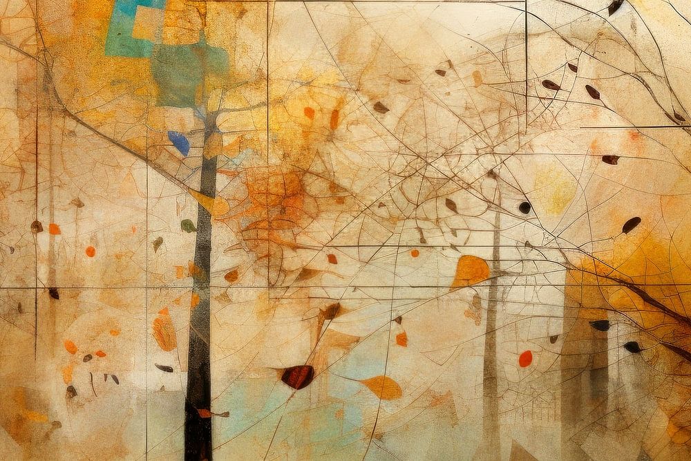 An abstract painting in beige, terracotta, soft brown, and warm earth tones with organic lines and falling leaves exudes tranquility. This timeless abstract work brings warmth, serenity, and a touch of nature to any space.