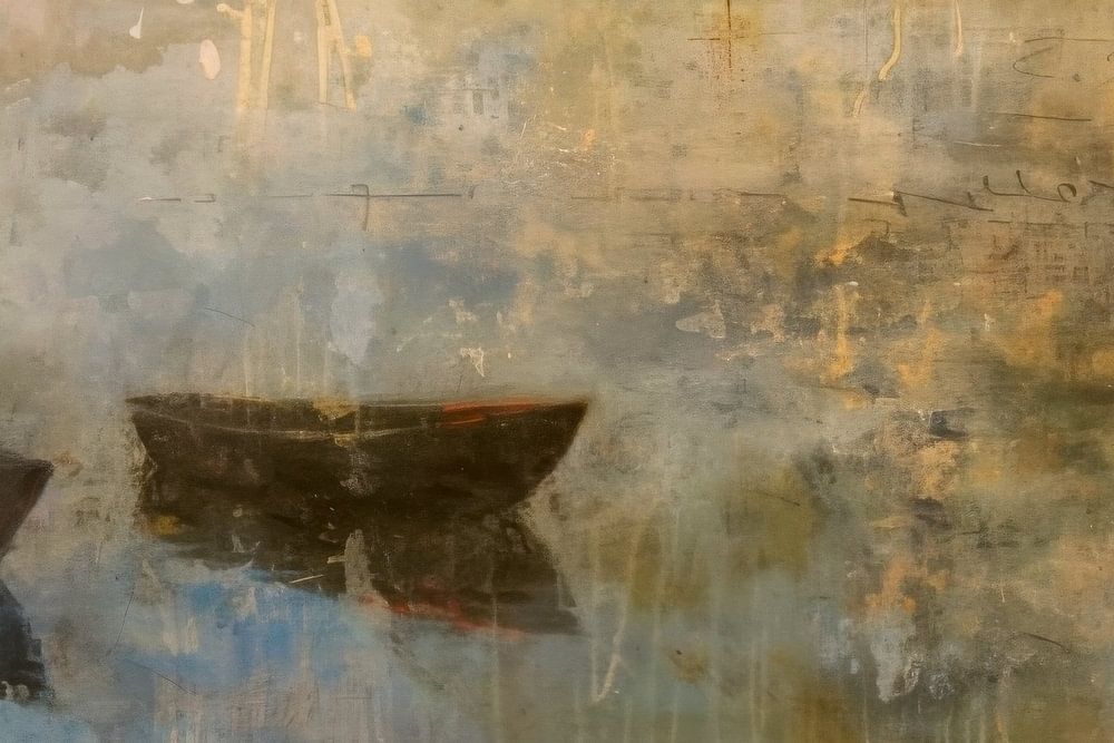 Abstract painting showing two boats on the water, with abstract musical notes in the background. The atmosphere is misty and serene. The colours range from soft blues, greys and beiges that create a calm and peaceful atmosphere. The hazy, ethereal effect adds to the mystical feel of the artwork. Subtle colour palettes and an evocative atmosphere were used. The muted, earthy tones sometimes appear slightly faded or pale. The use of soft colours adds to the mood of this work. The atmosphere is subdued, suggestive and somewhat mysterious, enhanced by the controlled use of colour and vaguely recognisable subjects.