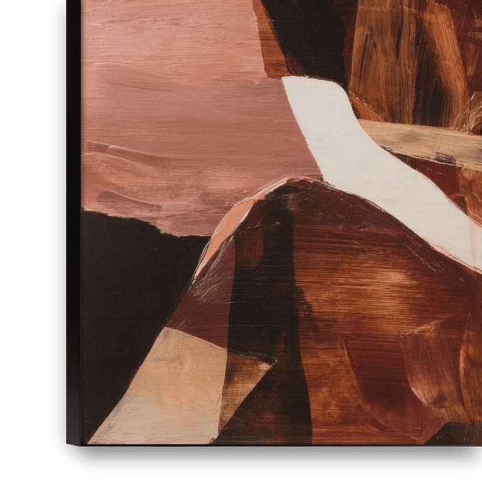 This abstract portrait of a woman exudes timeless elegance and tranquillity. The soft contours and silhouette in profile are combined with deep earth tones such as brown, rust and terracotta, creating a warm and chic look. The balance between abstract brushstrokes and minimalist lines makes this work both modern and refined.