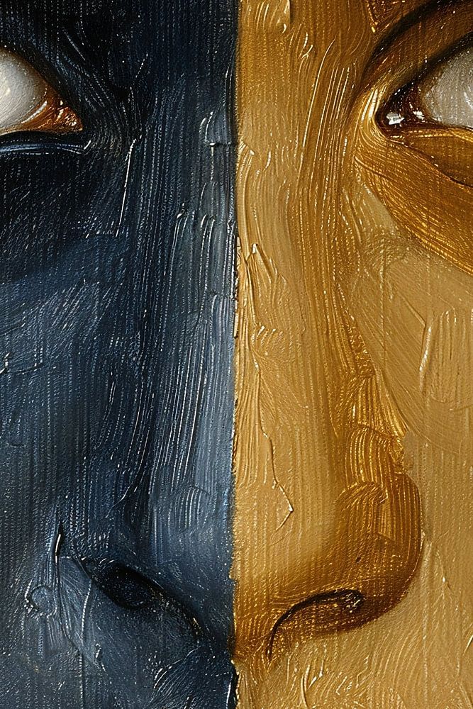 This striking and abstract artwork depicts an intriguing portrait of a woman, with half of her face painted in dark tones and the other half in warm, golden colours. The contrasting colours and expressive brushstrokes create a dynamic and compelling image that feels both modern and timeless. Perfect for modern interiors, this artwork adds a touch of sophistication and mystery to any space. Hang it in your living room or office to make a powerful visual impact guaranteed to spark conversation. A must-have for lovers of modern and abstract art.