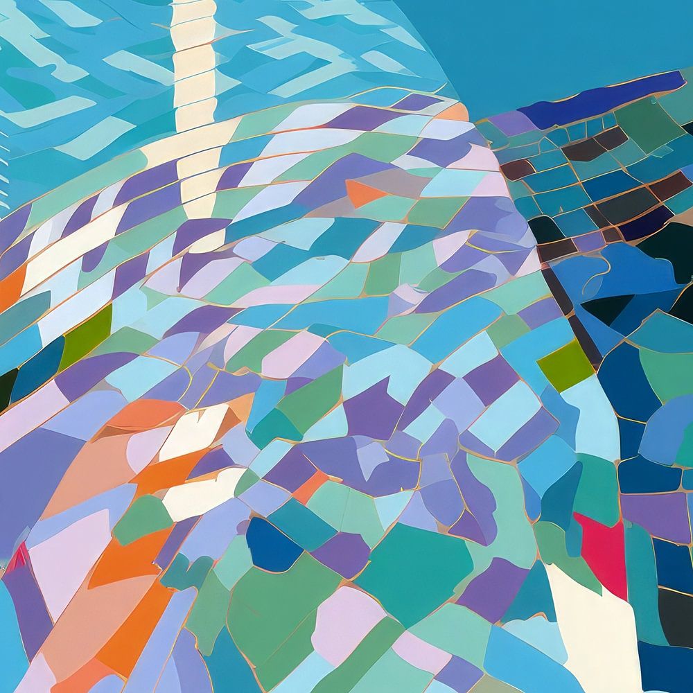 The colourful palette includes various shades of blue, turquoise, purple and green. There are also accents in orange, beige, red, pink, lilac and soft yellow. The style is figurative with an abstract approach to detail.