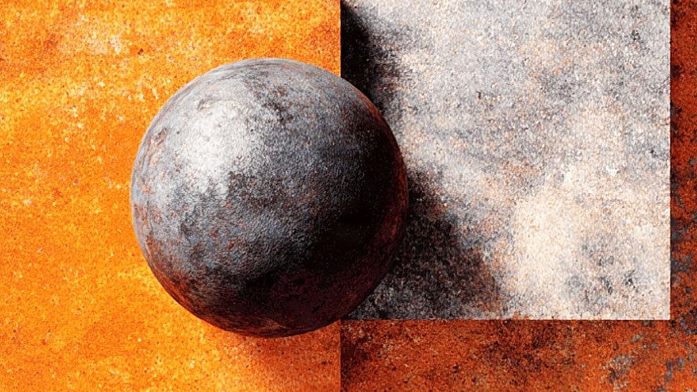 This artwork depicts a modern abstract composition in which a dark sphere is centred on a bright orange square, surrounded by multiple layers of square planes in shades of grey and orange. The shapes overlap subtly, creating a sense of depth and structure. The combination of rough textures and powerful colours makes the whole dynamic…
