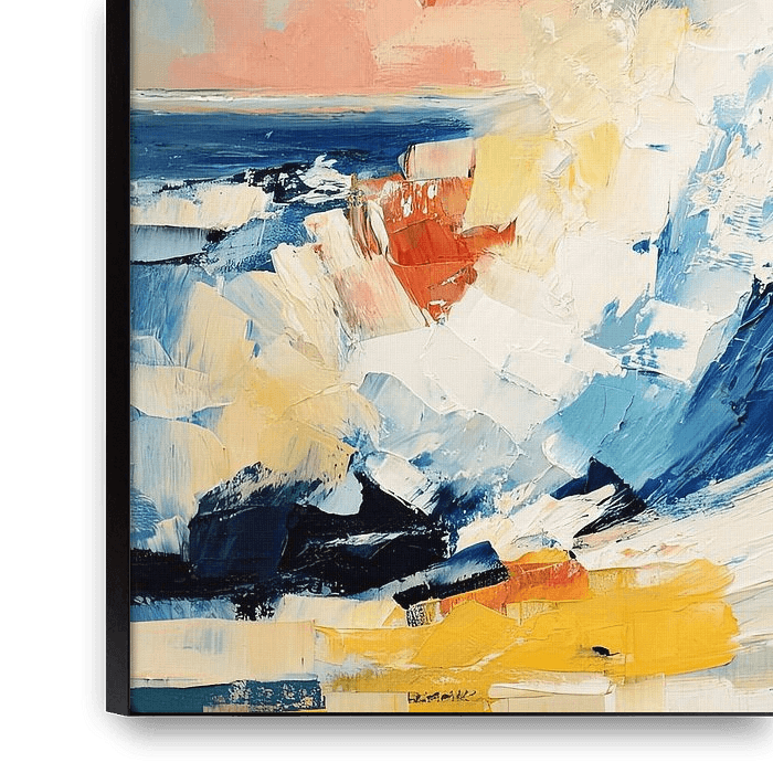An expressive, abstract representation of the roaring surf. Rich dark blue contrasts with the bright white of the spray, while soft peach and yellow tones in the sky create a warm, luminous atmosphere. The dynamic composition captures the raw energy of the ocean and combines maritime power with modern, colourful aesthetics. A play of…