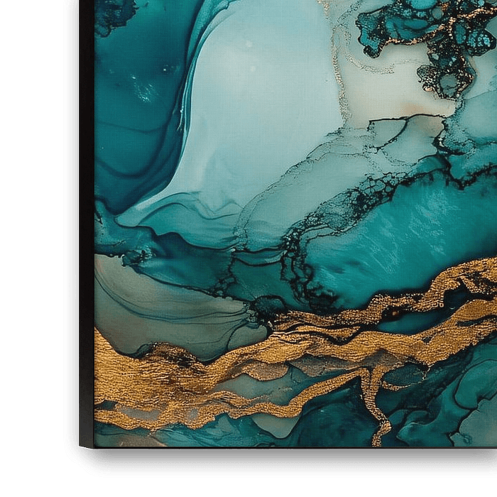 This unique artwork combines rich golden tones with vibrant turquoise colours to create an enchanting abstract representation of a tree. The tree with its whimsical branches and layered leaves appears to float on a background of fluid, undulating patterns. The gold accents give it a luxurious feel, while the turquoise colours exude tranquillity and balance. The design is perfect for modern interiors and adds an artistic flair to any space. This artwork would look great in an office or bedroom, where it will not only attract attention, but also exude a sense of serenity and elegance. Ideal for lovers of abstract art and natural elements in a contemporary style.