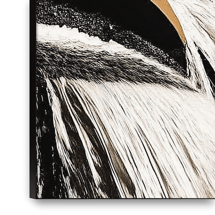 This unique artwork combines the fluid movement of a waterfall with abstract lines and a warm colour scheme. The contrasts between black, white and gold tones create a dynamic and elegant look. Perfect as wall decoration for modern interiors, it adds a sense of calm and sophistication to any room. Ideal for those who love abstract art…