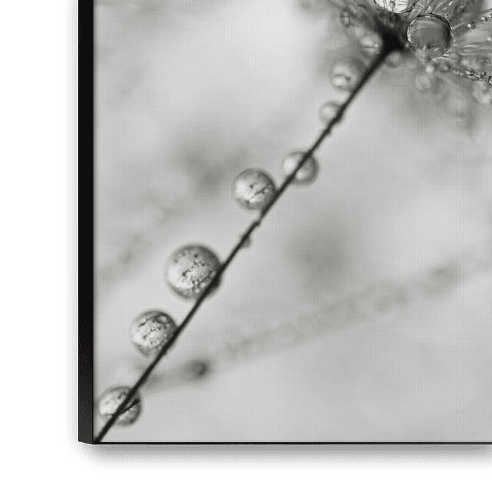 Abstraction in black, white and grey: 'Drops on dandelion fluff' is a macro photo of a dandelion fluff. On the fluff of the dandelion are small drops of water. In the background you can vaguely see other fluff of the dandelion. The depth of field is shallow which, besides creating a dreamy atmosphere, also creates a sense of depth in the work. The droplets also help to create this dreamy atmosphere, they reflect the light and create sparkles between the hairs of the dandelion fluff. The incidence of light and the simplicity of the lines of the fluff create an image that resembles a line drawing, white fluff against a dark background.