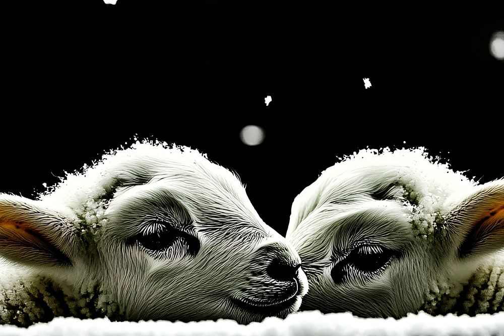 This beautiful design captures a moment of tenderness between two lambs covered in a subtle layer of snow, under a dark night sky. The refined details and soft contrast of black and white make this piece an ideal choice for any space that needs a serene and modern look. The simple yet powerful image reflects the purity of nature and radiates calm and warmth. Perfect as wall decoration in a bedroom or hallway, this design brings a sense of calm and connection with nature into your home.