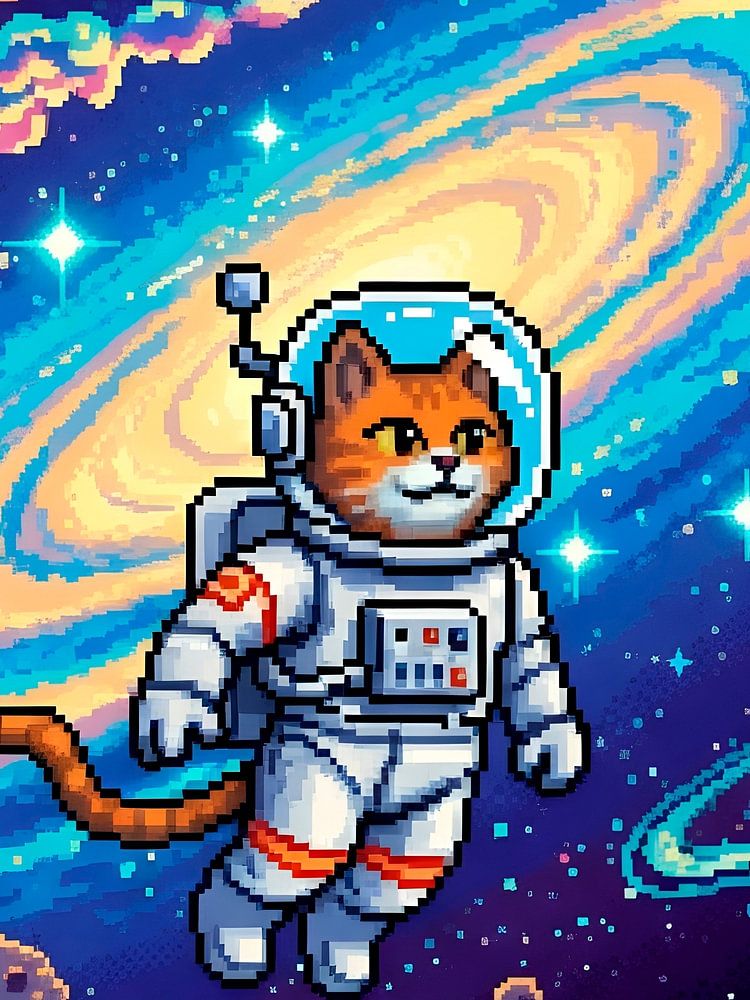 About "Adorable pixel cat astronaut floats through a vibrant, star-filled cosmic galaxy."