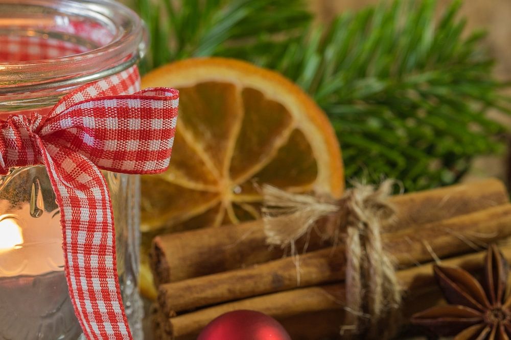 Advent and Christmas candle lantern with natural decoration on wooden table