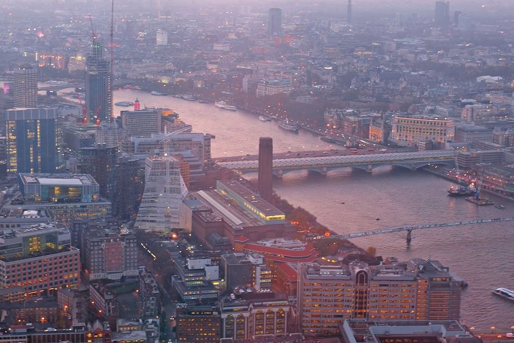 Aerial view of London and the River Thames with urban architecture at sunset in England