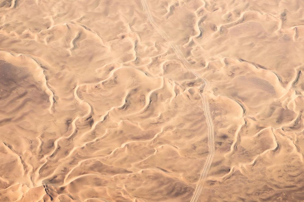 The Sahara desert in Africa seen from the window a plane at 10 kilometers altitude. The landscape is very impressive! The warm orange color of the desert is beautiful and stretches over a very large part of Africa. Flying over the Sahara, there seems no end to this orange desert, enjoying the view on the way to distant destinations.
