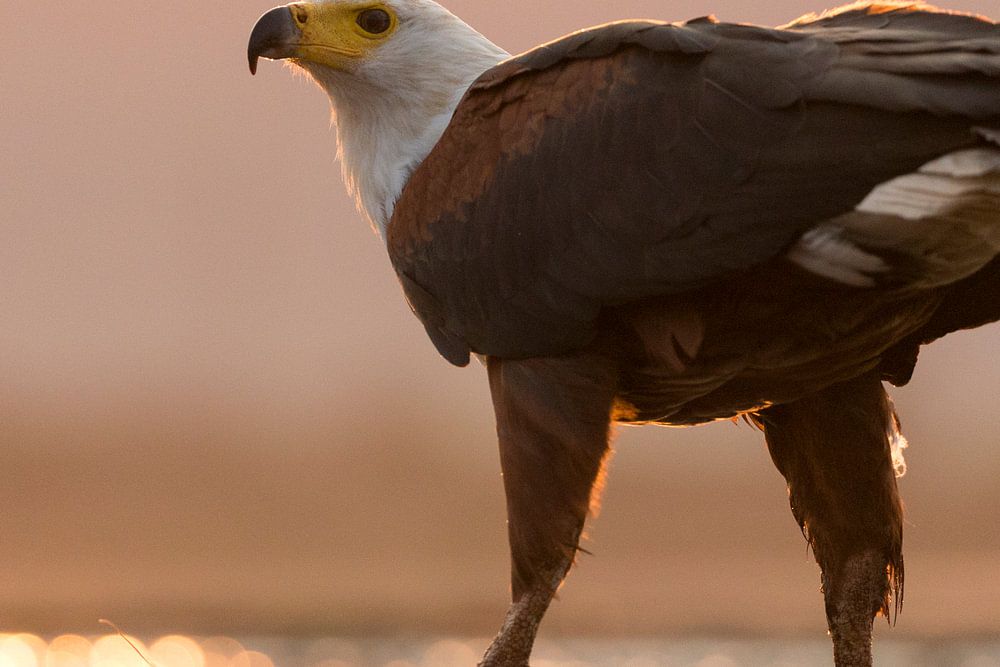 African Fish Eagle standing on a fish with backlight in South Africa. Looking over shoulder.