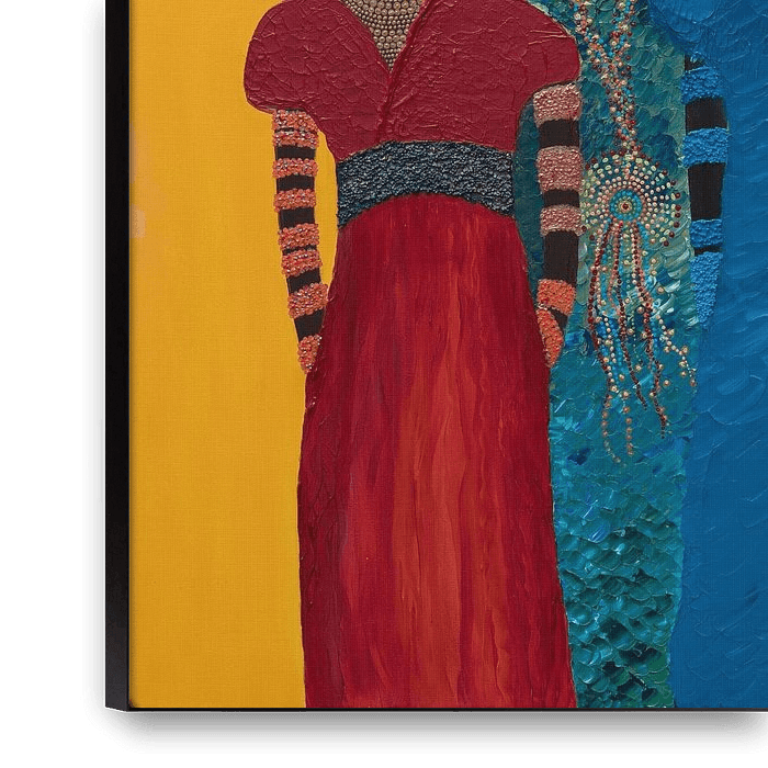 Zaya showcases a group of African women who together form a powerful and inspiring ensemble. Their elegant silhouettes are enveloped in dresses full of rich colours and expressive patterns, giving each figure its own character and dynamism. The background is kept subtle, so that the colours and details of the clothes and jewellery are…