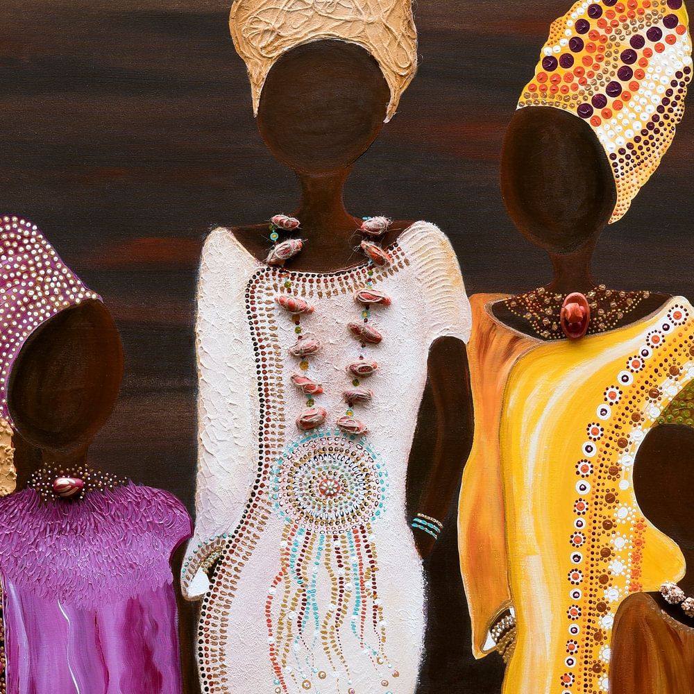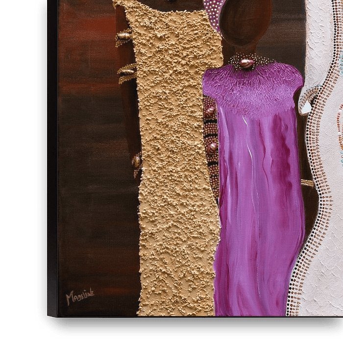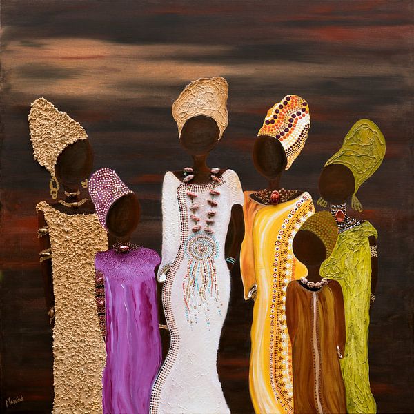 This painting shows six African women who together form a powerful and harmonious whole. Their bodies are elegantly stylised and enveloped in richly decorated, traditional robes full of colour and rhythm. Each figure has its own pose and appearance, which makes you discover new details as you look longer. The warm earth tones in the…