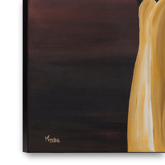 Mailaika shows two elegant African women who together form a serene and powerful composition. Their silhouettes are stylised and dressed in authentic clothing with subtle colour accents. The deep red background, combined with the warm, sultry hues of a setting sun, gives the painting an inviting, almost magical atmosphere and makes it a…