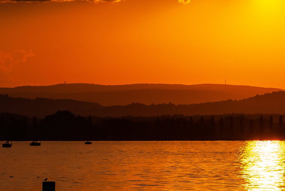 A beautiful sunset on Lake Constance, where bathers also bathe in the last sunlight of that day.