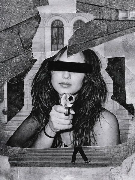 Aim Back is a raw and confrontational artwork that captures the tension and mindset of the street in a single powerful image. In this black-and-white collage, a female figure is depicted head-on, holding a weapon aimed directly at the viewer. The black bar across her eyes strips her of her identity, yet simultaneously reinforces her…