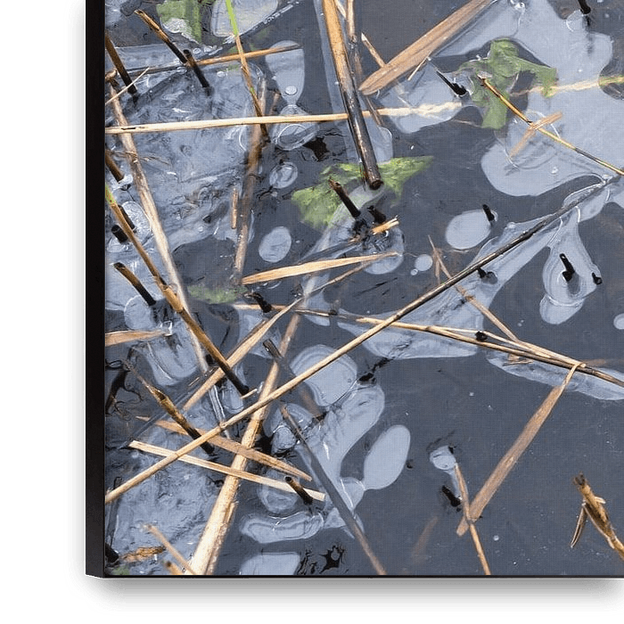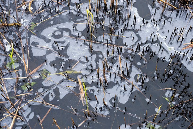 A detail shot of a piece of natural ice. Cut reeds protruded above the ice surface and formed a nice break in the ice structures.