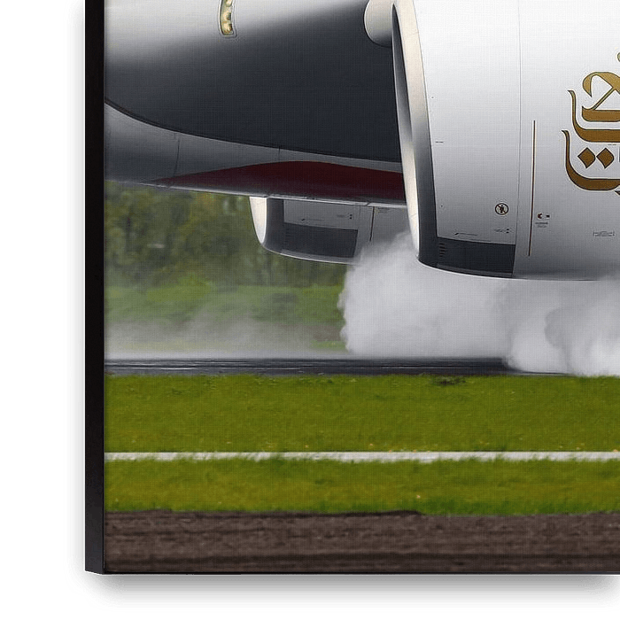 Airplane Boeing 777 during landing on a soaked track. A close-up of the hull and the engines, the wheels just hit the track and a cloud of splashing water can be seen under the huge airplane and the engines, the whole looks very spectacular.