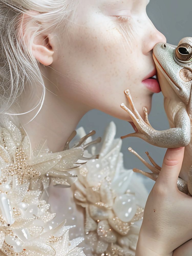 Albino girl kisses a fairy frog