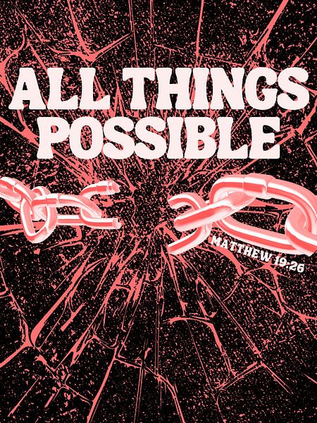 This impactful Christian poster highlights the promise of Matthew 19:26: “With God, all things are possible.” Featuring a dramatic broken-chain illustration over a shattered background, the artwork symbolizes freedom, breakthrough, and the strength that comes from faith. The bold visuals and strong contrast make the message stand out…