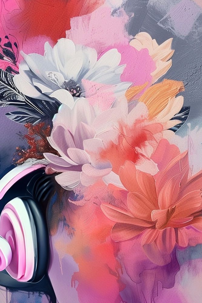 Abstract portrait of a woman buried in flowers listening to music through her headphones. Cheerful, colourful. spring-like and summery image in the colour scheme pink, purple, ,white,,, orange, yellow blue and grey. Matching various styles and trends, including spring, spring, music and Sweet embrace. Artist; Bianca ter Riet.