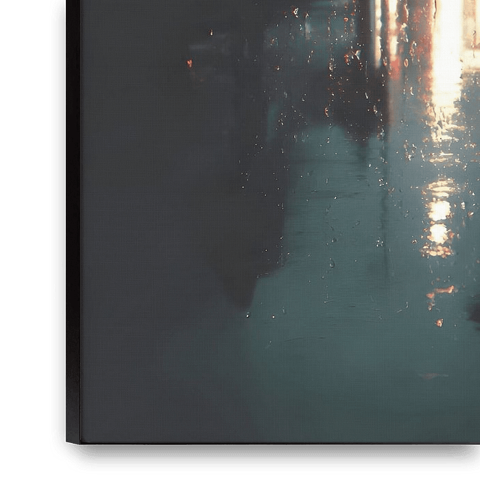 This abstract artwork captures an intense and recognisable moment in urban life: a person walking alone through the rain, past passing cars and reflections of light. The scene takes place on a wet road surface where headlights, street lights and raindrops come together in a dynamic play of colour and movement.