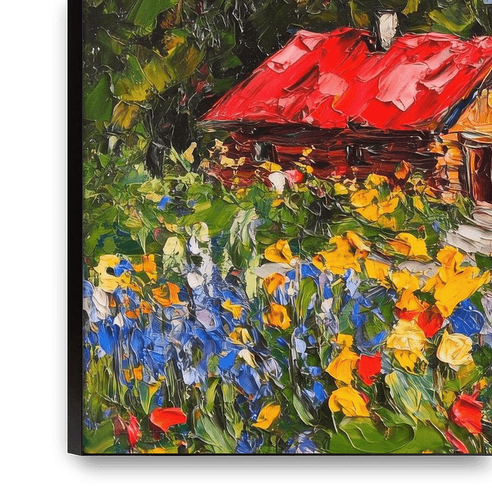 A charming wooden house with a bright red roof stands in the middle of a colourful sea of flowers. The majestic mountains in the background, crowned by shimmering snow, lend the scene an impressive backdrop. Intense colours and the gentle tranquillity of nature combine to create a harmonious picture of idyll.