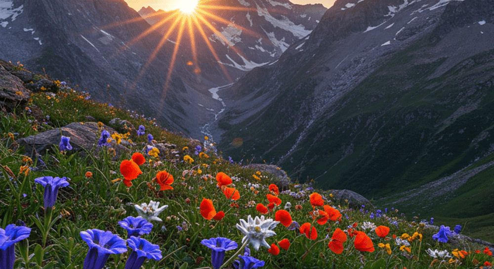 Experience the magical moment of sunrise between two imposing mountain peaks. The first ray of light breaks golden through the mountainous silhouette and scatters warm veils of sunlight over the rugged, snow-covered rocks. A blooming alpine meadow spreads out in the foreground, with red and blue wildflowers dancing gently in the morning light.
