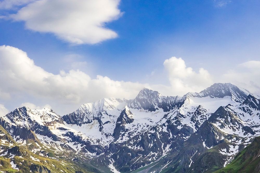 Alpine mountain landscape along the Timmelsjoch high mountain pass during a beautiful springtime day in the Italian Alps of South Tirol.
