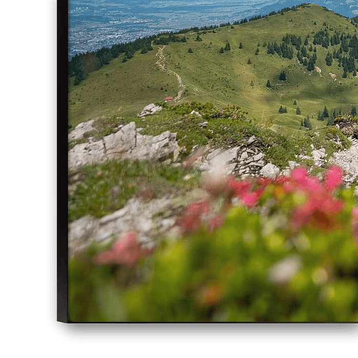 Buy the photo Alpine roses with a view of Bad Hindelang, Grünten and the Allgäu by Leo Schindzielorz on canvas, ArtFrame, poster and wallpaper, printed on demand in high quality.