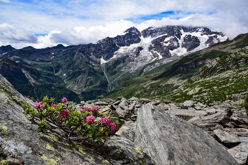 Blooming alpine roses in front of the glacial backdrop of the Monte Rosa massif in the Italian Alps.