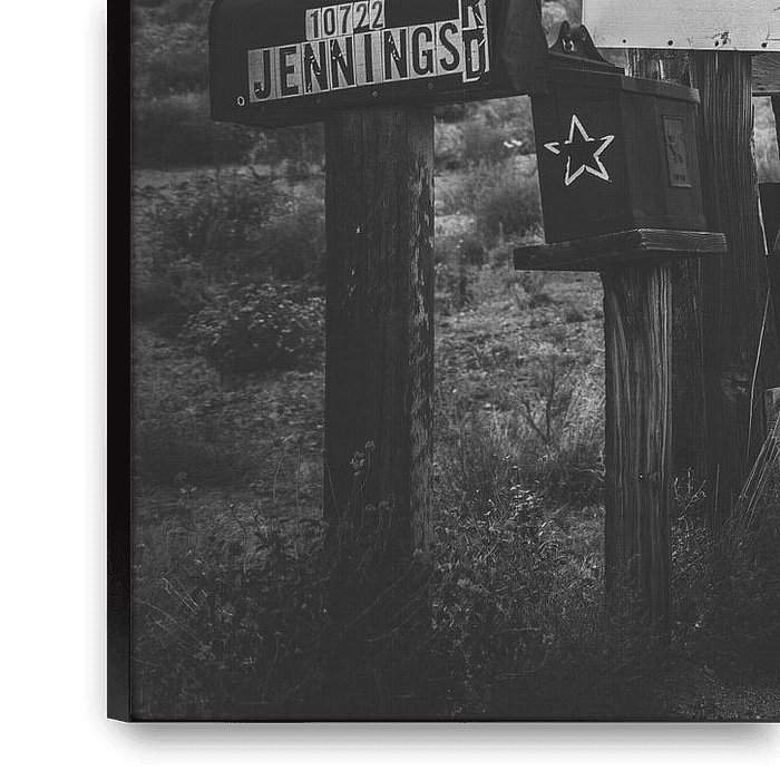 Amerikaanse brievenbussen in een heuvellandschap een karakteristiek Amerikaans plaatje langs route 66. Deze zwart wit versie geeft een krachtig sfeerbeeld.