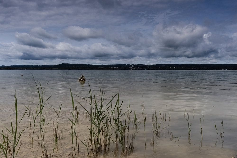 The picture shows a wide, calm view of the Ammersee in Upper Bavaria, under an impressive, cloudy sky. In the foreground, the shallow shore with its light-coloured stones extends gently into the water. A few stalks protrude upright from the shallow water, delicate but steadfast. The colours are muted but warm, everything in calming balance.