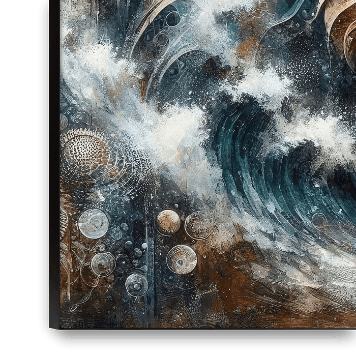 The picture shows an artistic depiction of a nautilus shell amidst a dynamic and abstract oceanic scene. The nautilus shell is stylised with intricate patterns and appears to merge with the waves, which are depicted in various shades of blue, white and brown, suggesting movement and fluidity. The background contains celestial elements…