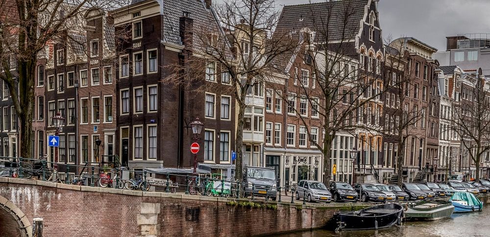 Image of one of the crosspoint of canals in Amsterdam. A well known spot with some beautiful historical houses along the canals. Dark clouds create for something dramatic in this image. Would be beautiful at your wall!