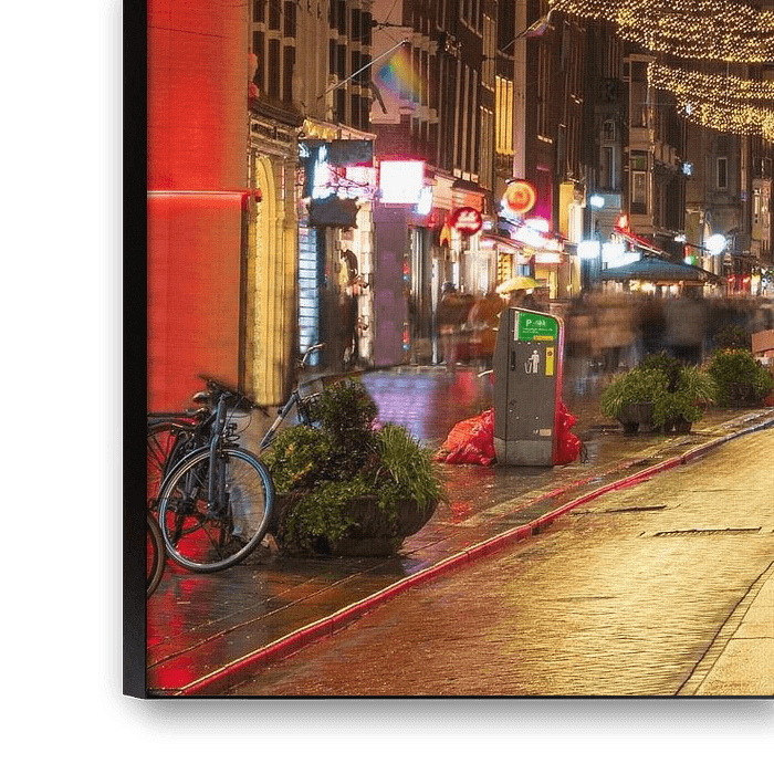 Amsterdam Damrak shopping street with Christmas decorations illuminating the busy street in the evening during a cold winter night. A tram is driving on the street in the distance.