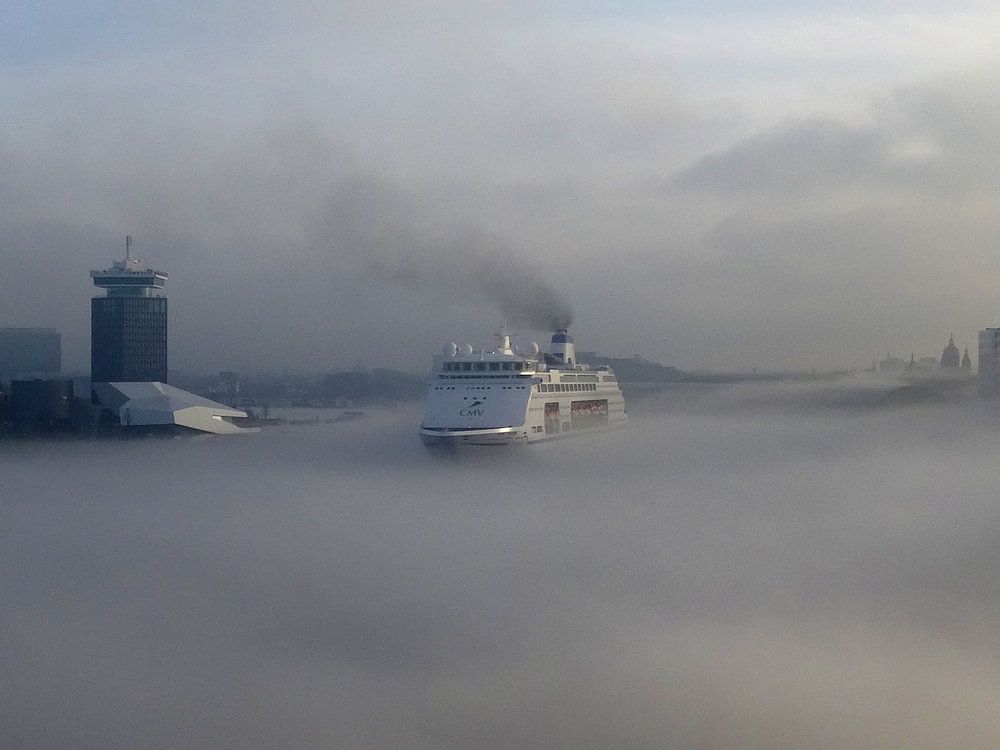 Amsterdam IJ cruiseschip in de mist by Alex Gibbs