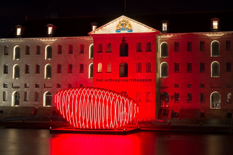 Amsterdam Maritime Museum (built in 1656, architect Daniël Stalpaert) during the Amsterdam Light Festival. The building is illuminated in red by Xinyi Wang's light art installation "Whale Fall", a whale carcass.