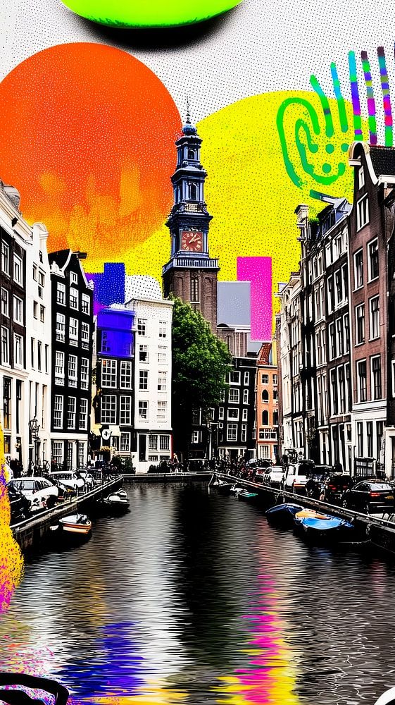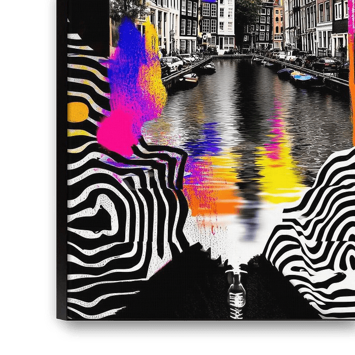 This explosive, funky painting transforms Amsterdam into a psychedelic dream world where pop art, street art and surrealist collage art come together. The iconic canal houses and waterfront tower form the realistic heart of the work, but are awash with bright neon colours, playful paint strokes and black-and-white graphic patterns reminiscent of optical illusions. Above the city floats an expressive, stylised face with brightly coloured lips, giving the scene a bold, modern energy. The reflection in the water blends the city with the colourful splashes of paint, as if Amsterdam itself were in motion. The result is a dynamic and contemporary ode to the city - vibrant, quirky and full of creative chaos.