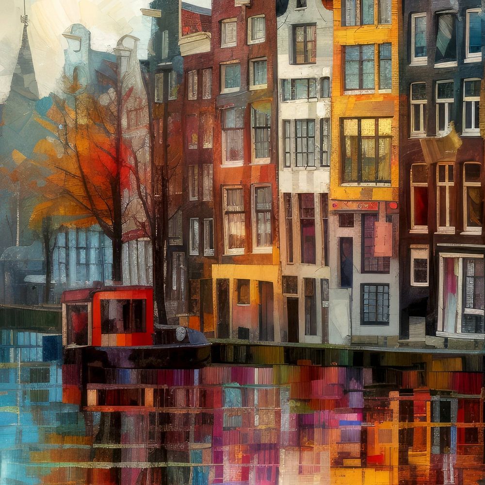 This artistic painting is inspired by the charming Amsterdam façades in all their splendour. Amsterdam's streetscape is dominated by rows of narrow, tall buildings with different colours and patterns on their facades. The canals, which flow quietly through the heart of the city, reflect the facades and add a sense of calm to the bustling city life. The use of vibrant colours and fine details bring the city to life and create a sense of depth and perspective. This painting is a beautiful representation of Amsterdam's historical heritage and invites the viewer to get carried away by the city's vibrant energy.