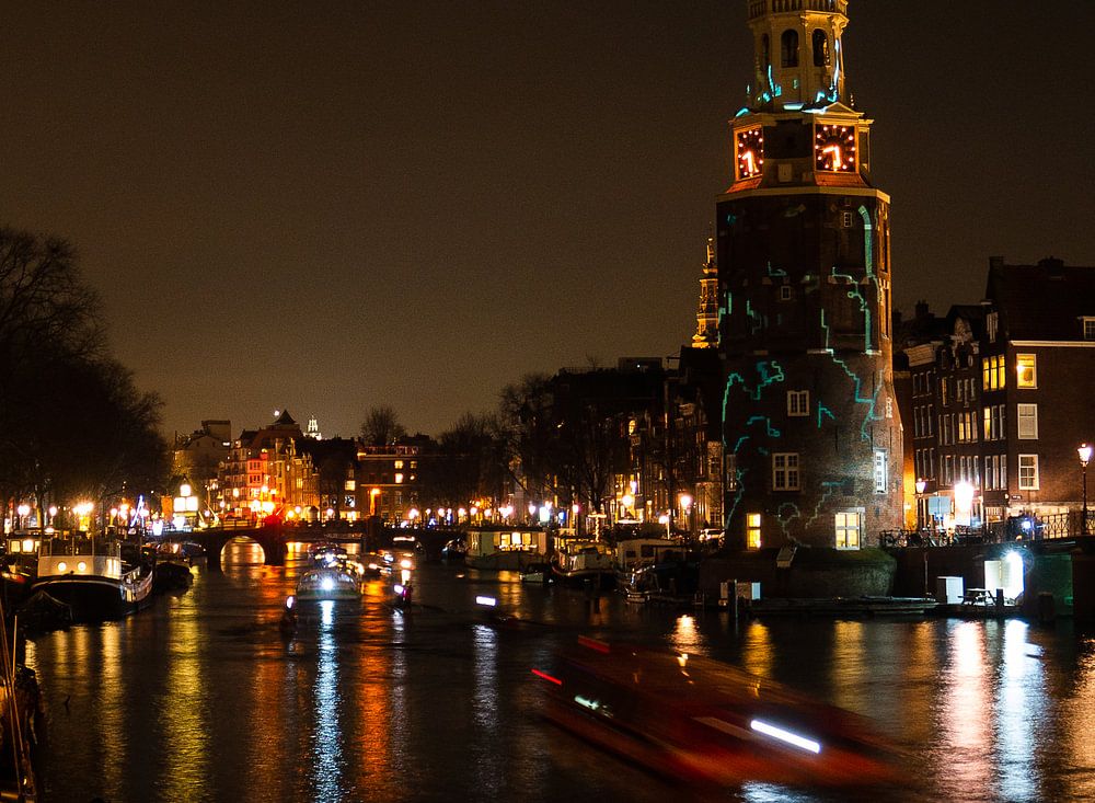 The canals of Amsterdam in the Netherlands are always beautifully lit in the evenings, with its churches and canal boats.
