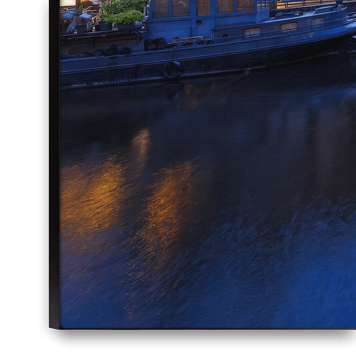 Brouwersgracht during the blue hour in winter. This shot was taken with a wide-angle lens. The curve in the fence provides nice depth. Shot on a tripod with a shutter speed of 0.5 sec