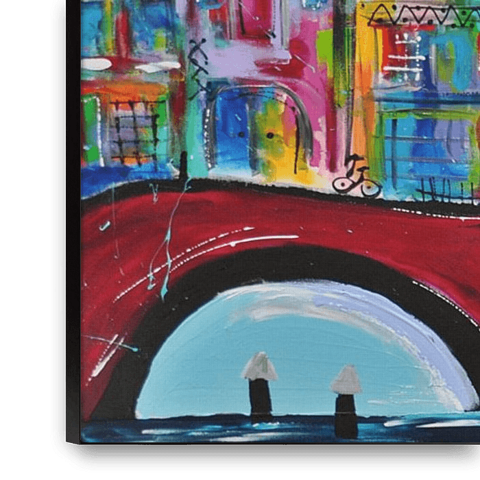 In this colourful work of Amsterdam's canals, the Hollands Grachten (Dutch canals) take centre stage. This painting is painted in the primeval Dutch atmosphere. Painted by artist Mir Mirthe Kolkman van der Klip in a modern figurative art style.
