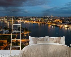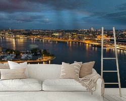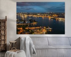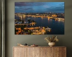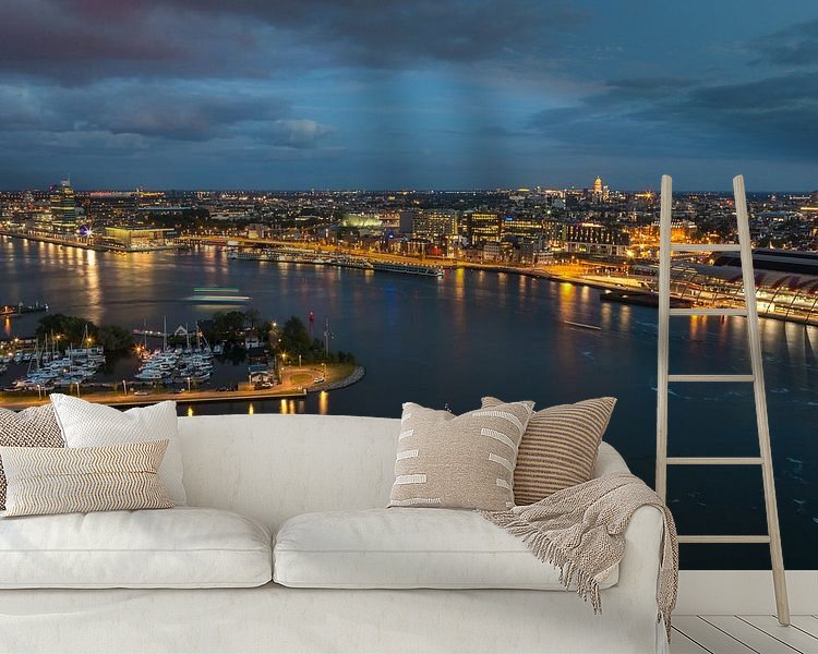 View in the evening light on the IJ and the city of Amsterdam with in the foreground the central station of Amsterdam from a great height