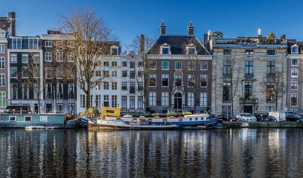 Amsterdam, the Capital City of The Netherlands. This images shows you the beautiful historic buildings along river Amstel on a cold but sunny day. In front of the buildings you see several house boats, a typical thing you will see along the canals. Would it not be something beautiful on your wall?