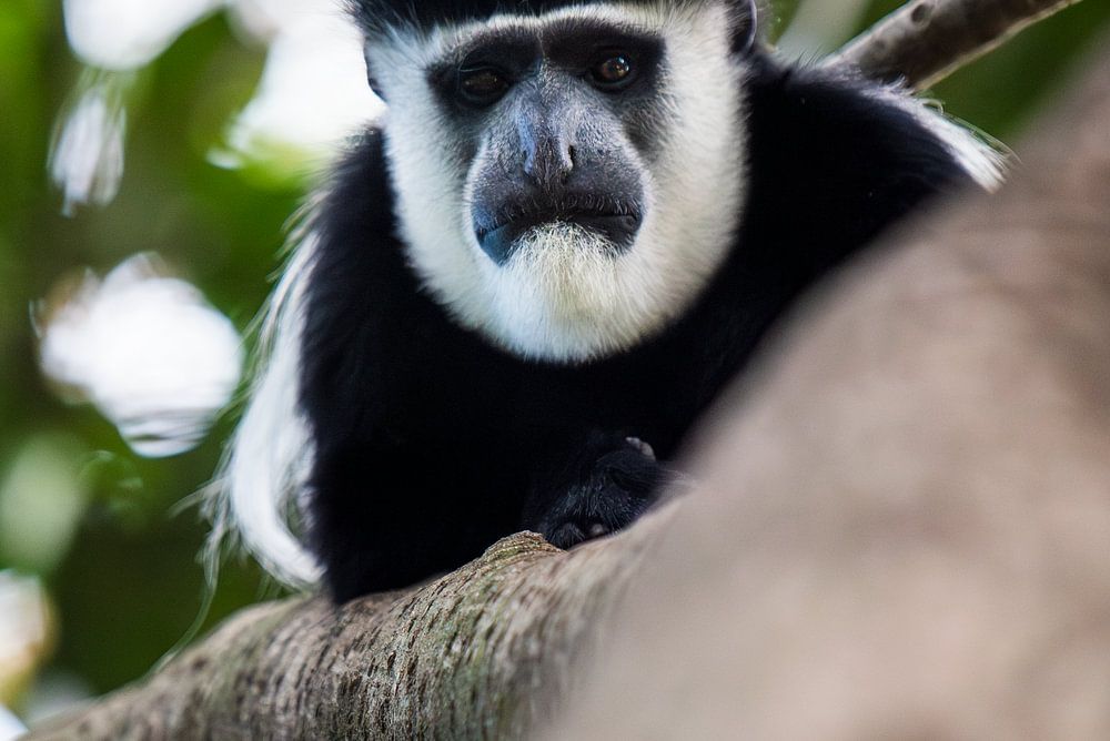 Colobus monkeys have a black fur that beautifully contrasts with their white mantle, tail and beard.