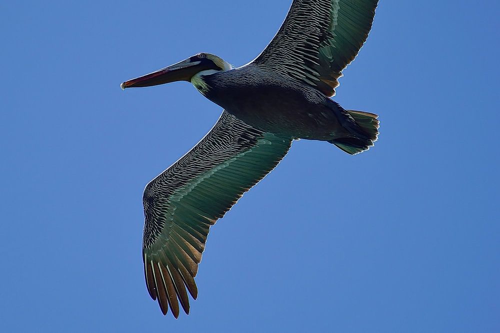 Many different species of birds can be admired while driving along the Overseas Highway in Florida, USA. This here is an Eastern brown pelican flying over.